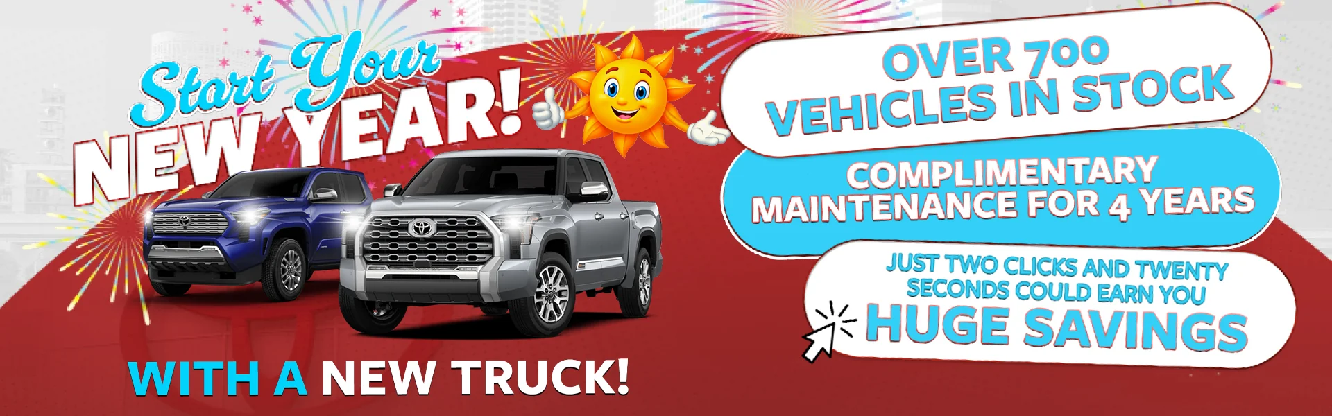 Covers normal factory-scheduled maintenance for 4 years or 25,000 miles, whichever comes first. Toyota recommends service every 6 months or 5,000 miles. Vehicles serviced based solely on time will receive up to 4 services under the ToyotaCare plan. Certain models require a different maintenance schedule as described in their Maintenance Guide. Excludes those items listed in the Maintenance Guide under Special/Severe Operating Conditions. 2 Consult the vehicle’s Maintenance Guide for factory-recommended service and intervals. Service requirements and intervals vary by mode. Prices do not include tax, tag, title, registration, any dealer-installed accessories, or dealer-provided benefits. Additional fees include a pre-delivery service fee of $1,298 a Private Tag Agency Fee of $189, and an Electronic Registration Filing Fee of $598 which charges represent costs and profits to the dealer for items such as inspecting, cleaning, and adjusting vehicles, and preparing documents related to the sale. The price for pre-owned vehicles excludes the $2995 Sun Toyota Protection package. We strive to update our inventory regularly, but there may be a delay between the sale of a vehicle and inventory updates. Prices, specifications, and availability are subject to change without notice. Pricing includes all applicable manufacturer incentives and may not be combined with other exclusive offers. All advertised prices are for in-stock units only and include all applicable dealer, manufacturer discounts and incentives. Some offers and incentives require financing through the Manufacturer Captive Lender, subject to approved credit. Please contact the dealer for the most current information and details. While every reasonable effort has been made to ensure the accuracy of this information, the dealership is not responsible for errors or omissions on this site. To receive any special or advertised pricing, a copy of the advertisement must be presented at the time of purchase. Due to supply chain challenges and limited inventory, vehicles may be subject to an additional market adjustment depending on inventory production, availability, and market conditions. We do not accept out of state bank drafts on new or preowned vehicle sales. See dealer for complete details. Prior sales are excluded. Offer Expires 2/2/26.